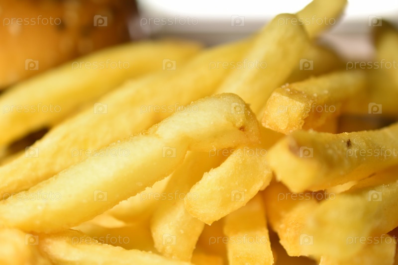 Гамбургер с мясом и картофелем фри на тарелке