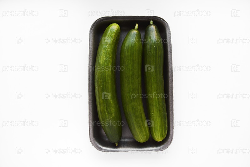 Зеленые свежие огурцы на черной подложке на белом фоне. Огурцы из магазина на белом фоне