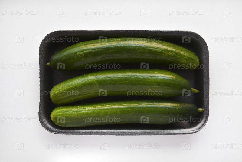 Зеленые свежие огурцы на черной подложке на белом фоне. Огурцы из магазина на белом фоне