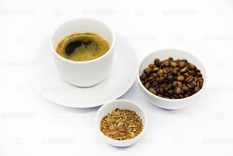 Фарфоровая кофейная чашка на белом фоне. Вкусный кофе в чашке и кофейных зернах. Растворимый кофе и кофейные зерна крупным планом