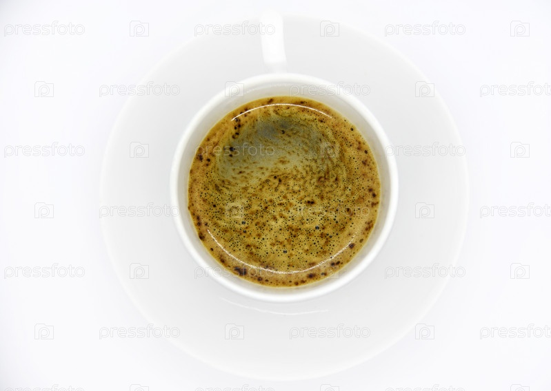 Фарфоровая кофейная чашка на белом фоне. Вкусный кофе в чашке и кофейных зернах