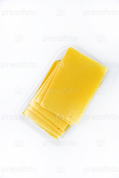 Тонко нарезанные ломтики сыра на пластиковой подложке. Вкусный нарезанный желтый сыр. Сыр в упаковке из магазина