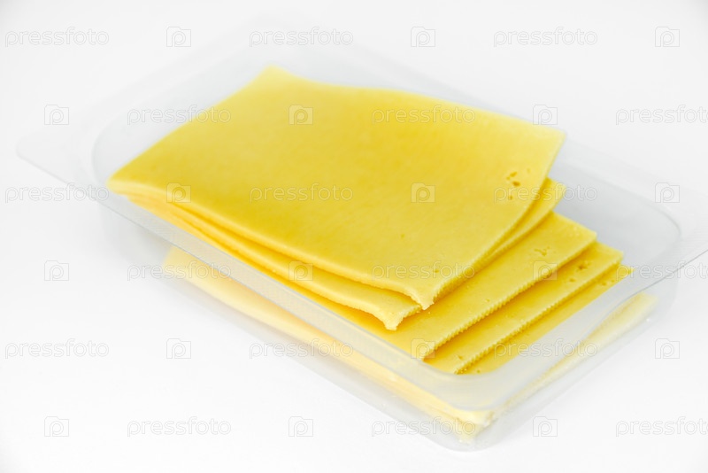 Тонко нарезанные ломтики сыра на пластиковой подложке. Вкусный нарезанный желтый сыр. Сыр в упаковке из магазина