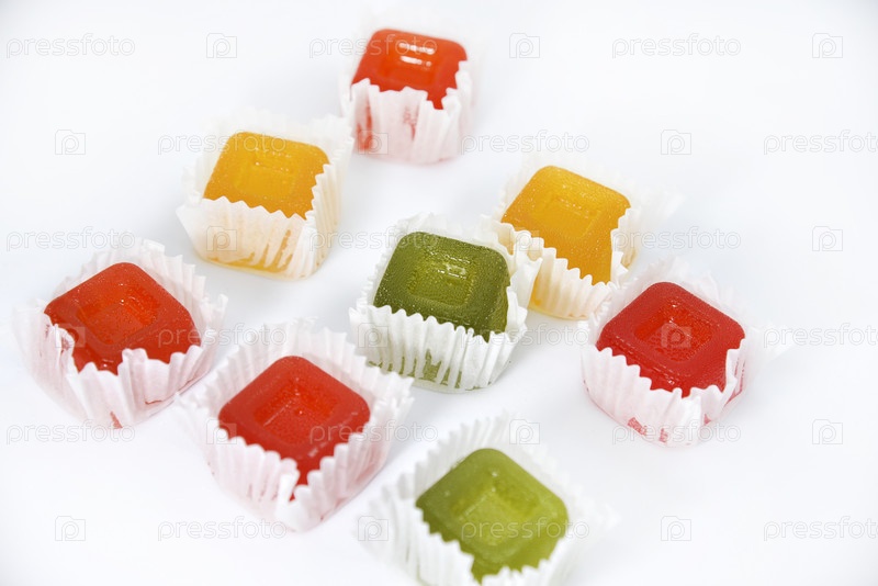 Квадратные ломтики фруктового мармелада на белом фоне. Вкусный сладкий мармелад. Разноцветные кусочки сладкого мармелада