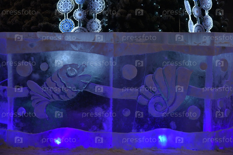 Челябинск, Уральская Россия - 01 03 2023: Ледяные скульптуры на площади Революции в Челябинске в новом году. Красивая иллюминация и новогодняя елка. Административные здания