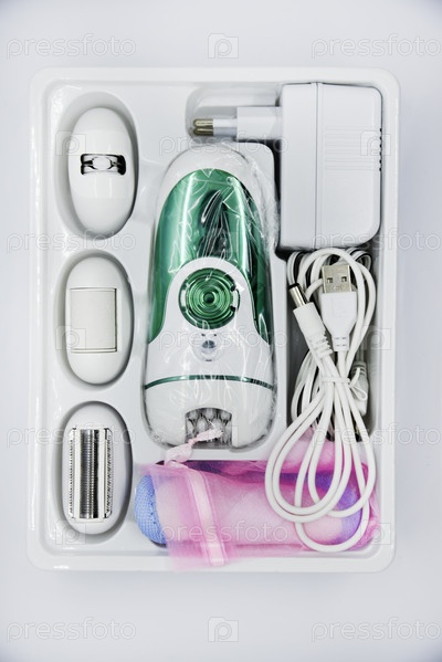 Женская электробритва для интимных мест. Набор женской бритвы для волос на белом фоне. Белая электрическая бритва