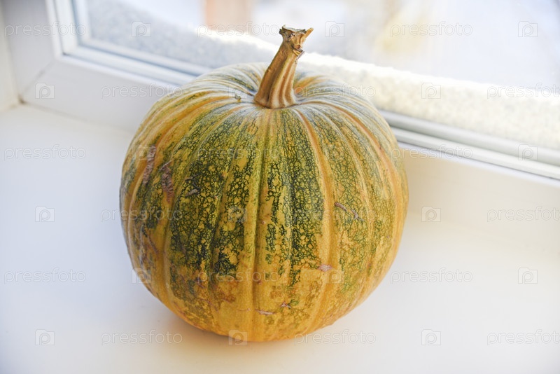 Желто-зеленая тыква на подоконнике. Большая тыква на белом фоне
