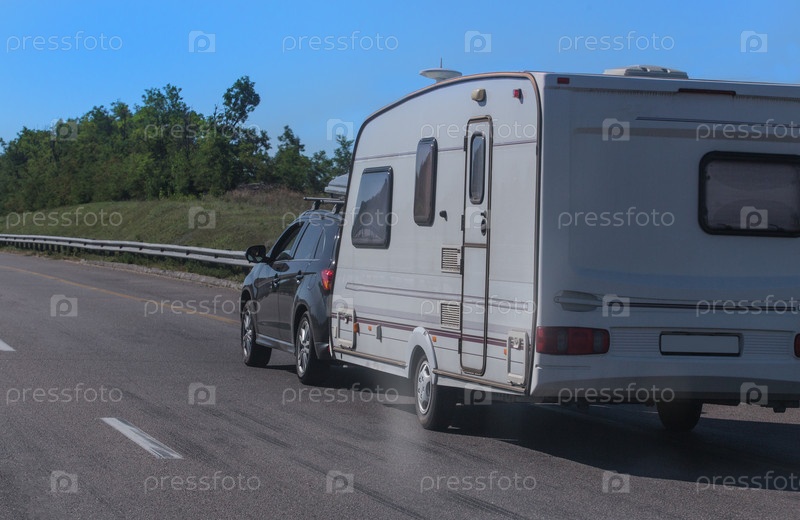 Внедорожник с прицепом для кемпинга движется по дороге
