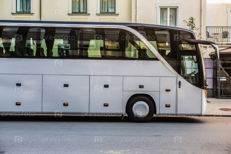 Туристический автобус движется по улице