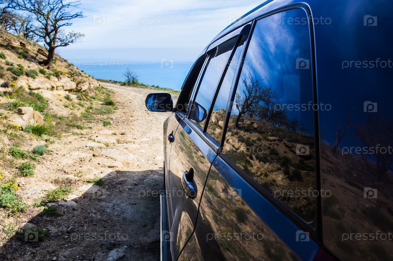 Внедорожник движется по грунтовой горной дороге