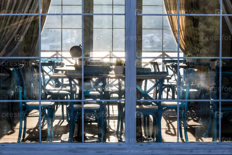Интерьер кафе за стеклянным фасадом на закате