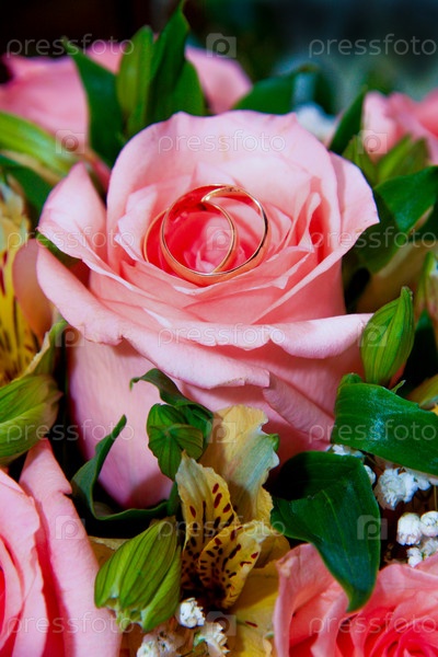 Золотые обручальные кольца на букете роз
