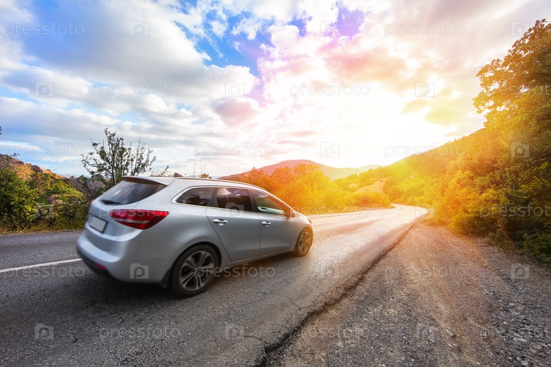 Кроссовер едет по шоссе в гористой местности