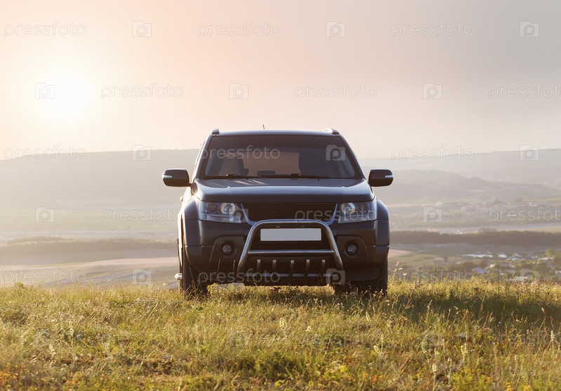 Внедорожник на рассвете на фоне гор