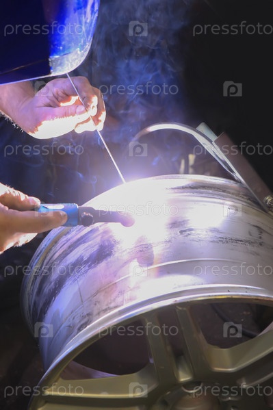 Сварщик ремонтирует алюминиевое колесо автомобиля
