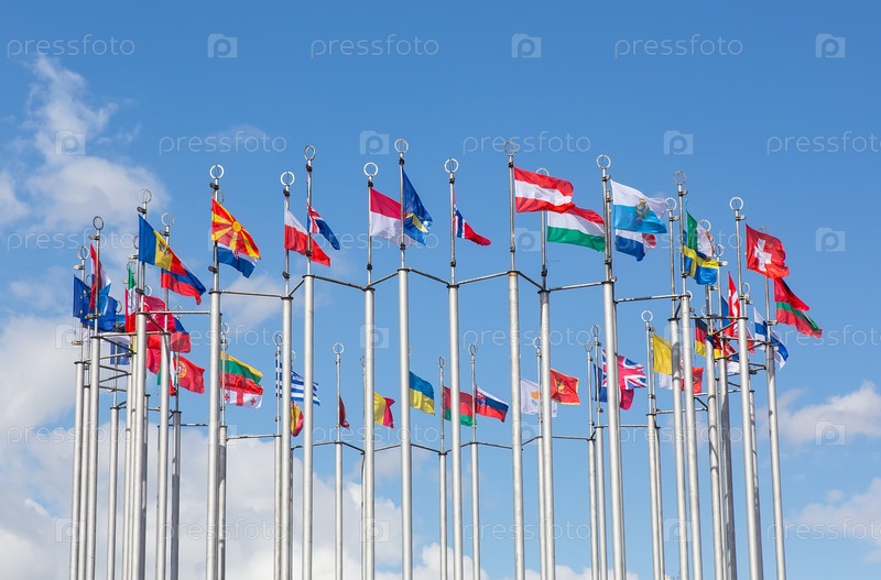 Флаги европейских государств на флагштоках на фоне облачного неба