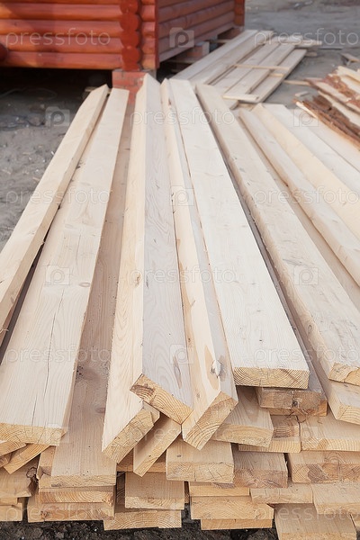 Доски в стопке против деревянного дома