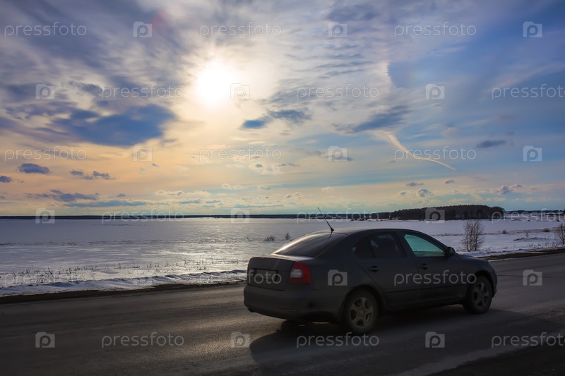 Машина движется по дороге вдоль зимнего замерзшего озера