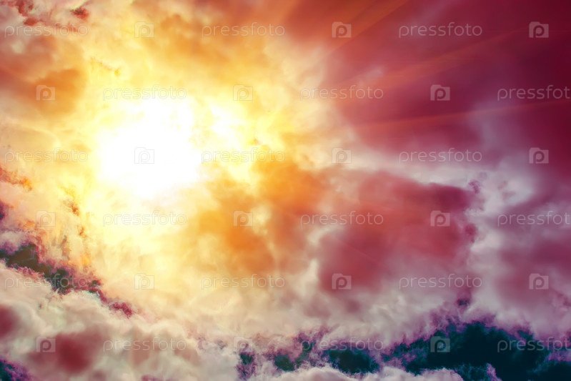 Красные, оранжевые и красные солнечные лучи смотрят сквозь кучевые облака