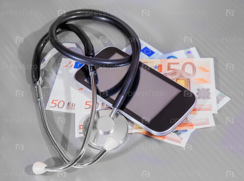 Смартфон банкноты евро и стетоскоп