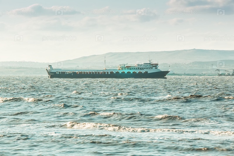 Морской грузовой паром. Горный фон
