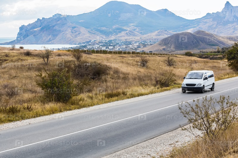 Минивэн движется по проселочной дороге в гористой местности