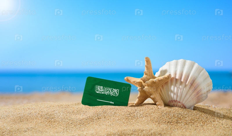 Тропический пляж с ракушками и флагом Саудовской Аравии. Концепция райского отдыха на пляжах Саудовской Аравии