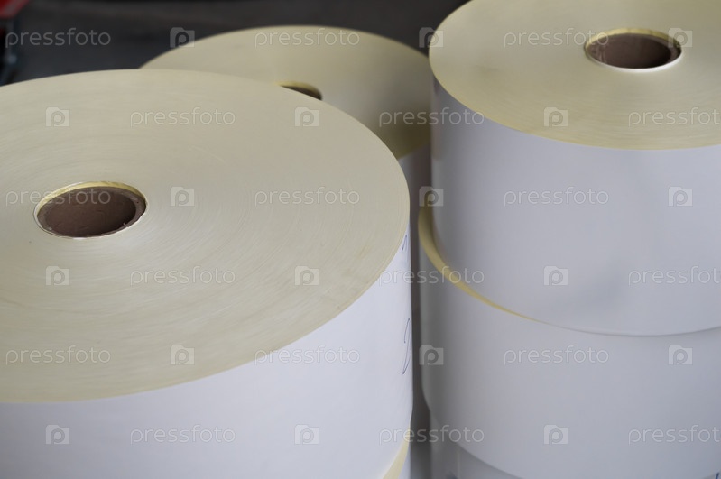 Рулоны белой офсетной самоклеящейся бумаги для печати цветной этикетки. Бумажные валики на картонном сердечнике. Склад бумажных материалов типографии. Выборочный фокус