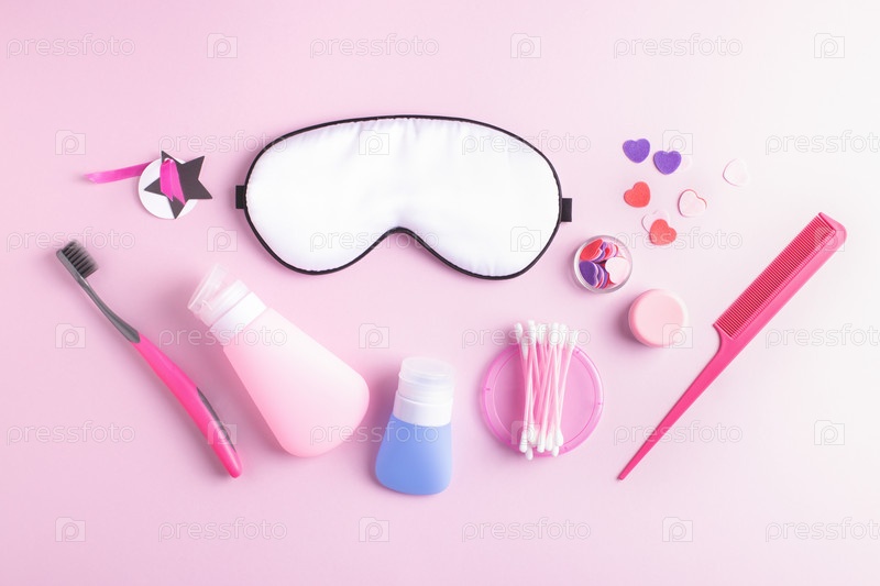 Вид сверху на белую маску для сна и косметические продукты для девочек, изолированные на пастельно-розовом фоне