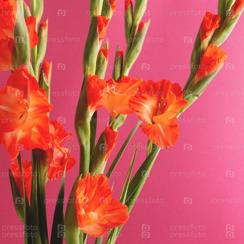Праздничная квадратная яркая открытка с красными цветущими цветами на малиновом фоне с копировальным пространством