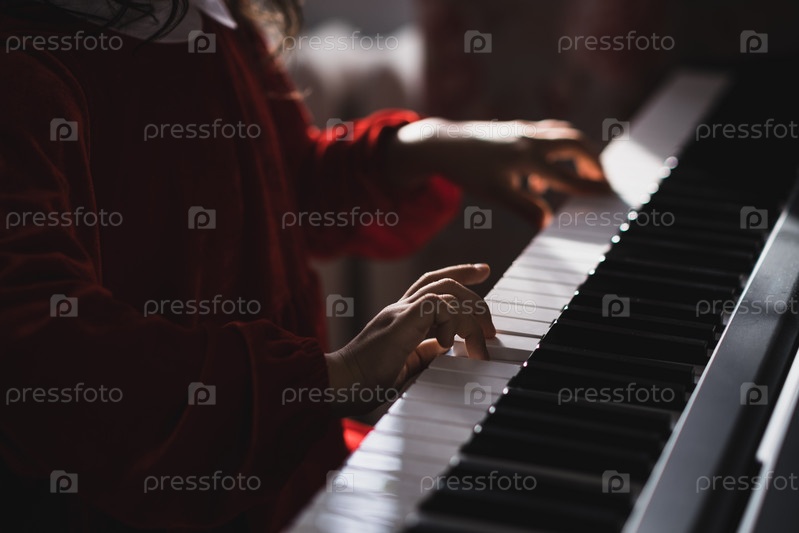 Маленькая девочка в красном бархатном платье играет на электронном пианино