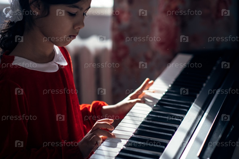 Маленькая девочка в красном бархатном платье играет на электронном пианино