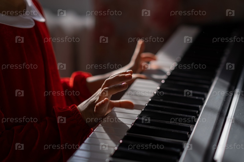 Маленькая девочка в красном бархатном платье играет на электронном пианино