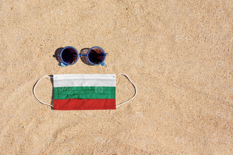 Медицинская маска цвета болгарского флага лежит на песчаном пляже рядом с очками. Концепция организации безопасного пляжного отдыха в Болгарии в период пандемии коронавируса
