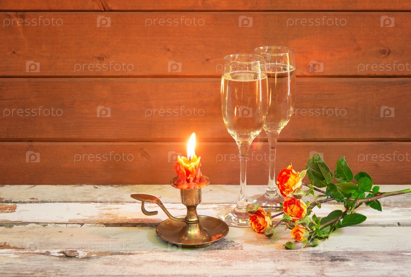 Горящая свеча, бокалы шампанского и ветка апельсиновой розы на старом деревянном столе