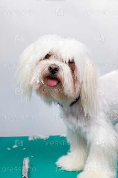 Красивая мальтийская игрушечная собака на столе в салоне груминга