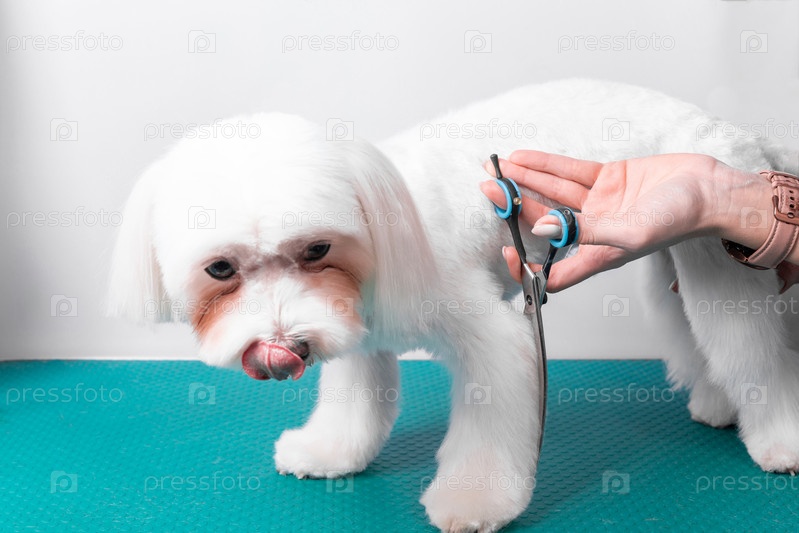 Профессиональный грумер ухаживает за мальтийской болонкой в салоне красоты для животных
