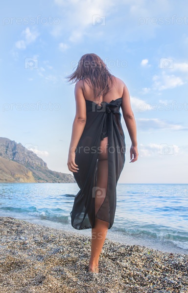 Девушка в черной прозрачной ткани и плавках ходит по песчаному берегу