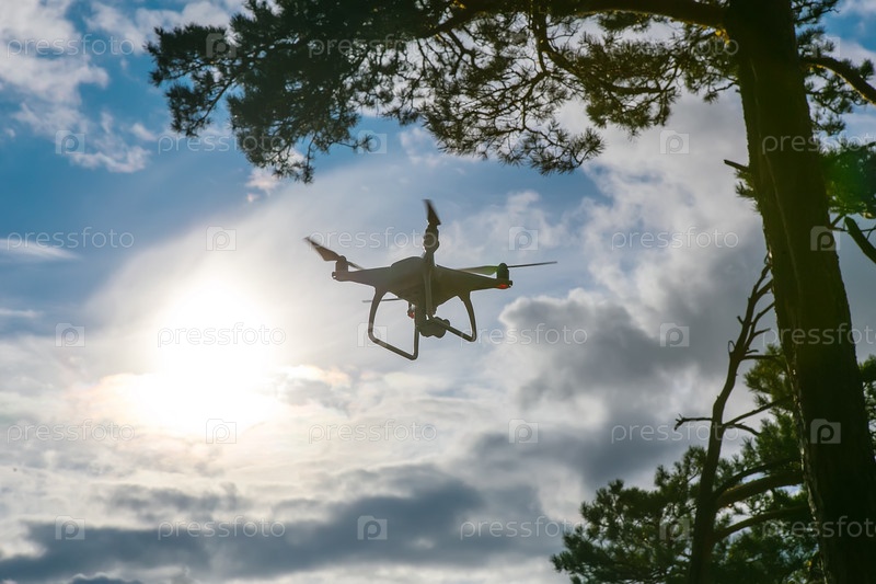 Летающий дрон в голубом небе