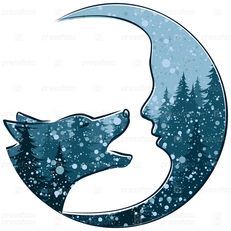 Волк с зимним ночным лесом и месяцем