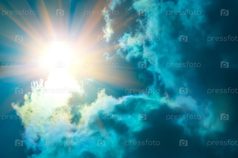 Лучи солнца сияют в голубом небе