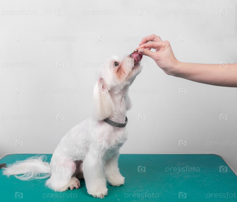 Парикмахер угощает мальтийскую болонку после стрижки за хорошее поведение
