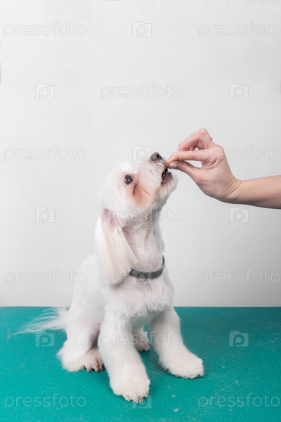 Парикмахер угощает мальтийскую болонку после стрижки за хорошее поведение