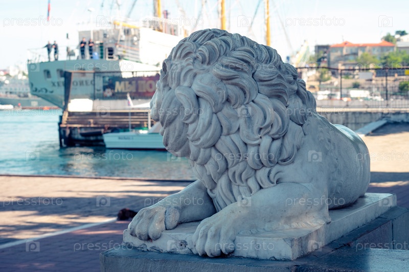 Севасополь, Крым - 31 мая 2019 г.: Скульптура льва на графской пристани на размытом фоне корабля