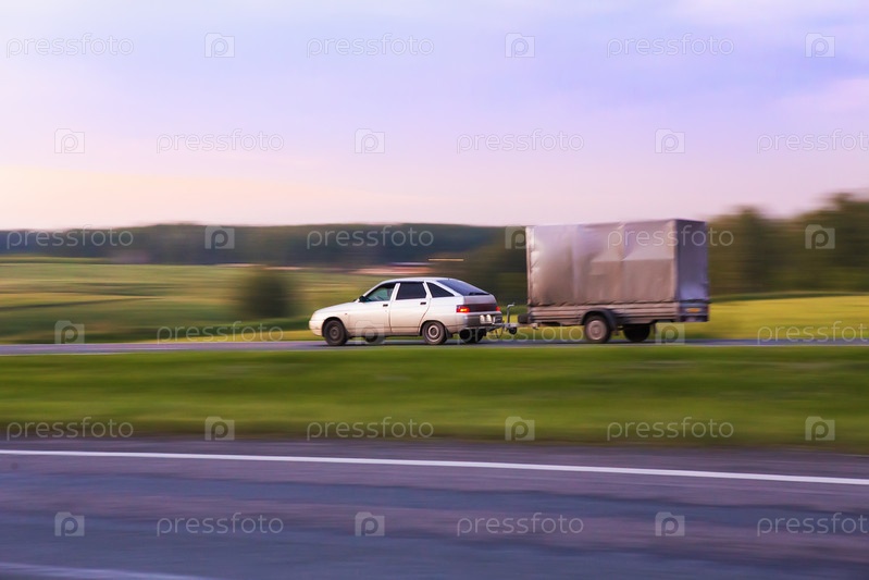 Машина с прицепом движется по шоссе