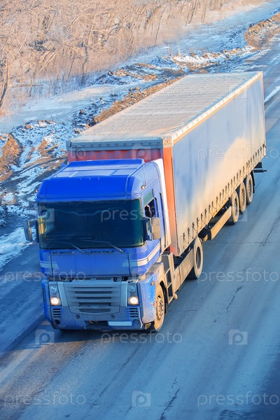 Грузовик едет по зимнему снежному шоссе