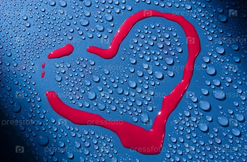 Рисунок красной краской в форме сердца на поверхности стекла в окружении капель воды. Заявление о любви. Крупный план. Фон