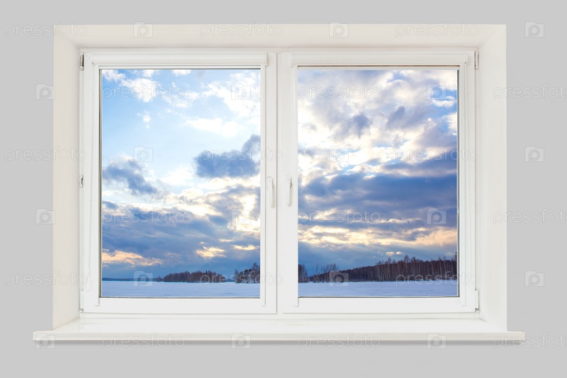 Вид из окна на зимний пейзаж с замерзшим озером