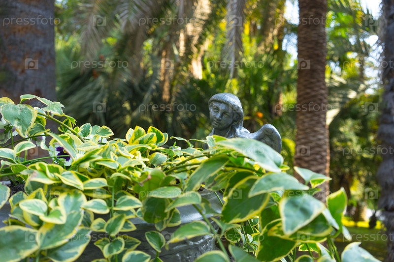 Серебряная ваза с растениями на фоне природы в дендрарии