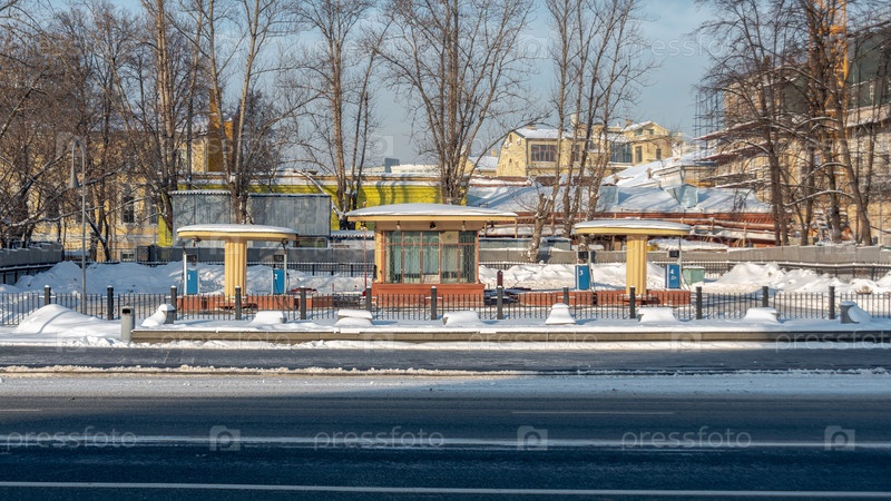 Москва, Россия - 18 января 2021 г.: Вид на Кремлевскую АЗС на улице Волхонка со смотровой площадки Храма Христа Спасителя, Москва, Россия